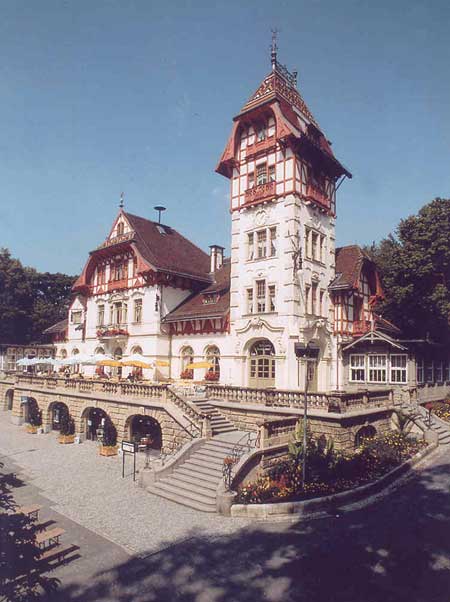 Der Theresienstein ist eigentlich der Stadtpark, in dem sich die Jugendstil-Villa befindet. Aber weil das Haus selbst niemals einen eigenen Namen erhalten hat, wird es - genauso wie der Stadtpark - Theresienstein genannt. In dem Haus hat niemals ein Adliger, ein Wirtschaftsmagnat oder eine sonstige von der Öffentlichkeit bewunderte Persönlichkeit gewohnt. Es wurde als Gesellschaftshaus konzipiert und hat - seit seiner Eröffnung 1902 bis heute - ausschließlich den schönen Dingen des Lebens gedient, der Geselligkeit, dem Tanz und der Unterhaltung. |